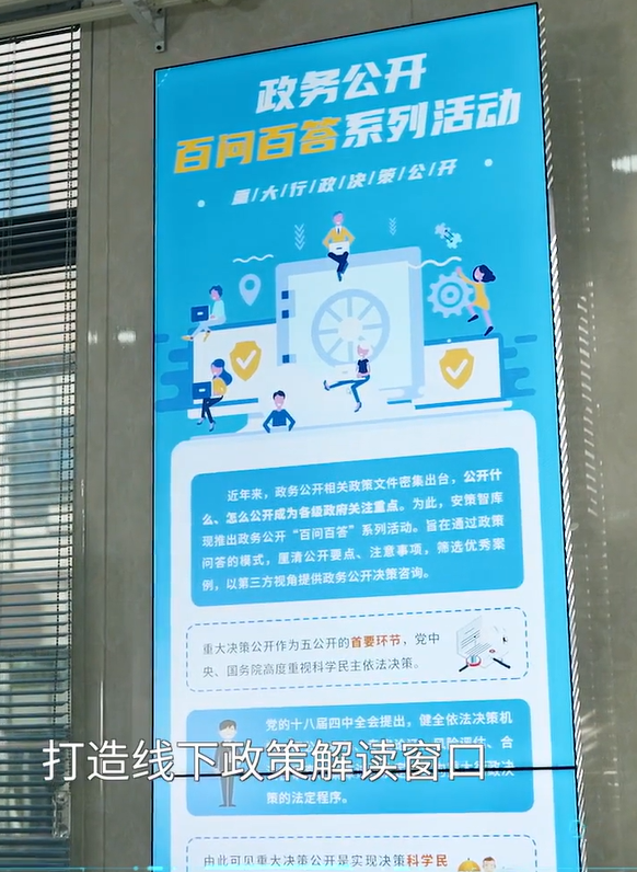 政务码上知,解读看专栏。围绕个人一生事和企业全生命周期梳理各阶段的高频事项,设计二维码矩阵,实现政务码上知。定制专业政策解读宣传展示竖屏,动态播放本地民生重点政策图解,打造解读速递栏。