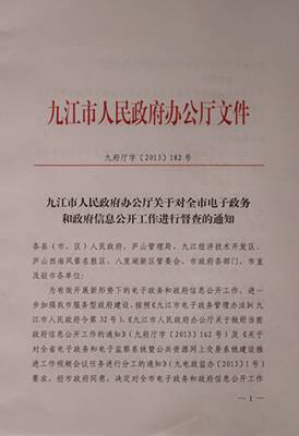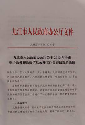 我市充分运用政府信息公开统一网络平台、政府网站、信息公开触摸屏、政务微博、政府公报、广播电视、资料手册、各项专栏、宣传栏等平台,及时主动公开各类政府信息。其中,政府信息公开统一网络平台统一规划了政府信息公开指南和概况信息、法规文件、发展规划、工作动态、人事信息、财经信息、行政执法、公共服务共8大类29小类的政府信息公开目录。市、县两级政府在档案馆、图书馆和行政服务中心设立了政府信息公开查阅点,配备计算机、触摸屏等设备供社会公众上门查阅,开展依申请公开代办服务。市直部门建立了本部门的政府信息公开查阅室,一部分单位能主动向档案馆提供公开的政府信息。部分单位不断探索方便实用、行之有效的办法,把公开内容和形式有机统一起来,利用手机短信等作为发布重大决策信息、接受群众监督的渠道。2014年1月,市政府办公厅印发《关于2013年全市电子政务和政府信息公开工作督查情况的通报》(九府厅字〔2014〕6号),列举政府信息公开工作做得比较好的县(区)有:浔阳区、星子县、湖口县、德安县、庐山区;政府信息公开工作做得比较好的部门有:市发改委、市安监局、市农业局、市公路局、市人社局、市林业局、市食品药品监督管理局、市工商局、市港口局、市地税局。