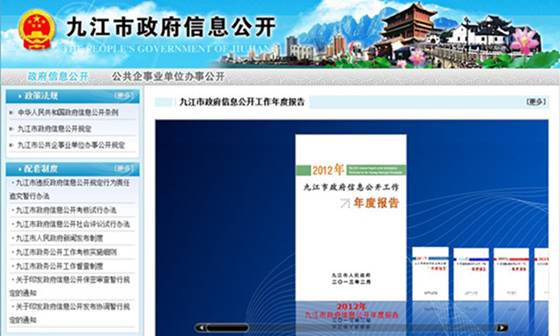 "中国九江网"在首页显著位置制作了政府信息公开专栏。专栏下设政府工作报告、新闻发言、机构职责、公告公示、工作规则、人事任免、政策法规发展规划、政府文库、城市规划、行政许可、行政收费、财政收支、九江统计、政府采购、承诺服务、土地交易、应急管理、产权交易、公务员考录、工程招标、政府大事记等40个子栏目。定期进行查漏补缺,截止年底,"中国九江"网累计发布信息12.6万余条,新增信息1.6万多条。新增49项办事事项、及时更新九江年鉴、领导之窗、政府重要工作、统计信息、政府机构、政府工作报告、政策解读、行政收费等信息,同时还对一些栏目链接情况进行了定期检查和修改。制作个人社会保险信息、住房公积金、公用事业账单等便民检索系统,方便人民群众及时查询信息。与市级机关网站、各县(市、区、山)政府网站建立了链接,方便市民查阅各政府机关主动公开的政府信息。各县(市、区)政府网站、市级机关网站分别在显著位置设立了政府信息公开专栏,发布各类政府信息。