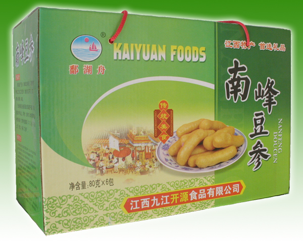 南峰豆参为都昌地方传统美味食品,因其酷似人参,故名为豆参。始创于清代,外形黄澄澄、油亮亮、吃起来香润可口,其主要原料为黄豆和黑豆。