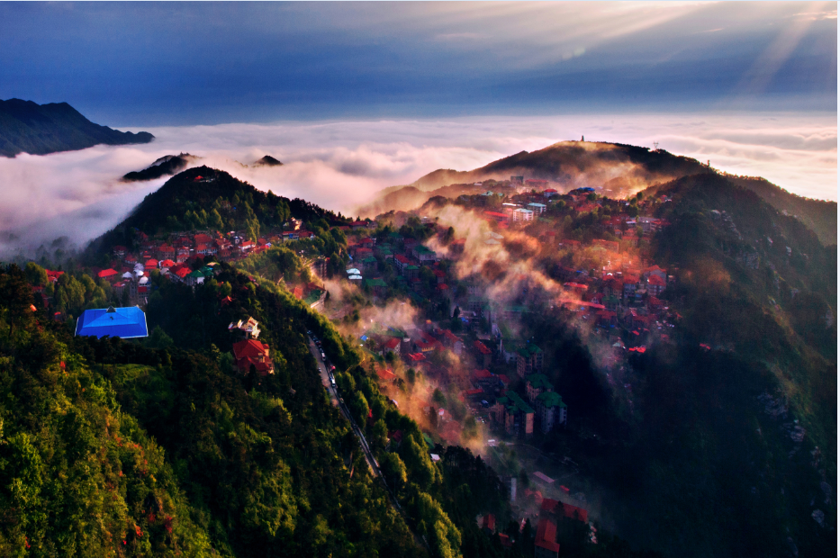 牯岭,庐山的中心。三面环山,一面临谷,海拔1164米,方圆46.6公里,是一座桃源仙境般的山城。牯岭原名牯牛岭,因岭形如一头牯牛而得名。19世纪末,英国传教士李德立入山,租用了牯牛岭 的长冲,在这里兴建住宅别墅,逐步开发,并按其气候清凉的特点,据英文Cooling的音译,把牯牛岭简称为牯岭。 这座钟灵毓秀的山城,以牯牛岭为界分为东西两谷,地势平坦,峰峦葱茏,溪流潺潺。青松、丹枫遮天蔽日。近千幢风格各异的各国别墅依山就势而筑,高低错落,潇洒雅致,点缀在万绿丛中,与周围环境十分和谐,为国内少有的高山建筑景观。中华人民共和国成立后东西谷均辟为疗、休养,旅游接待区。疗养院、休养所、宾馆、饭店星罗棋布,接待来山游客。 山同城最繁华的地方是牯岭街。这条自东向西略成弧形的半面街道,蜿蜒于牯牛岭西麓,依山而建。商店、旅社、餐厅、书店、酒楼、车站、咖啡厅、舞厅、商场等服务设施均掩映在绿荫丛中,形成天街云市般的山镇。这里不仅是庐山政治、经济、文化、旅游接待和疗、休养的服务中心,而且是通往各景区、景点的交通枢纽。 位于牯岭街中心的街心公园,辟建于1954年,后于1987年重修。公园南背牯牛岭,北临剪刀峡,傍岭临谷垒坝筑土而成,面积为5000平方米。2000年又扩建5000平方米。公园呈三角形。园内曲径小道,蘑菇亭昂然。茂林娇花,芳草萋萋。园中央筑有一个半月形大花坛,坛上安放着一头卧即待起的石牛。石牛由数块巨石镶嵌而成,约高2米,长4米。造型生动,融合雕凿、圆雕、浮雕等技法,具有抽象的神韵,使一头强劲有力的牯牛借石质而生。基座上镌有现代书法家启功题写的“牯岭”二字。这头石牛表达了鲜明的主题,是牯岭的象征。 如今盛夏时节,避暑消夏的游人云集这里,清晨看日出,午间戏碧水,傍晚观夕阳。待明月高悬时,漫步在林间小道上,欣赏那松涛、清泉汇成的美妙交响乐……