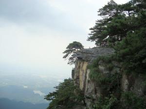 从天池前的石级下去,我们就来到了龙首崖,他又被称为舍身崖,据说很久以前,天池寺内有一名沙弥与一个山村姑娘情投意合,暗中结为百年之好,但小和尚苦于是佛门中人,不能相配。有一天,大雾茫茫,雾浪滚滚,这一对情人误以为圣佛驾祥云来渡他们前往极乐世界,便匆匆地赶到天池寺西南的凌空悬崖上,跳入云海之中,他们的诚意感动了黎山圣母,将他们救往仙境,共享天伦之乐,故称舍身崖。明江西布政史照磨刘世扬来此游览,见此崖酷似卧龙昂首,欲飞天外,更名龙首崖。苍崖缝中,一虬松倒倚悬崖间,如龙须,人称卧龙松。自古此崖奇险,无人敢攀,只有明代理学家王阳明“局身徐步,若龙蜿蜒,竦立崖前”,人称“有胆”。