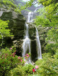 三叠泉瀑布汇集五老峰、大月山诸水,循着天工琢成的三级“冰阶”断崖折叠而下,故名,亦名三级泉、水帘泉。飞瀑流经的峭壁有三级,溪水分三叠泉飞泻而下,落差共155米,极为壮观,撼人魂魄。三叠泉每叠各具特色。一叠直垂,水从20多米的巅萁背上一倾而下;二叠弯曲,直入潭中。古人赞其:“上级如飘云拖练,中级如碎石摧冰,下级如玉龙走潭,散珠喷雪,真天下绝景。”站在第三叠抬头仰望,三叠泉抛珠溅玉,宛如白鹭千片,上下争飞;又如百副冰绡,抖腾长空,万斛明珠,九天飞洒。如果是暮春初夏多雨季节,飞瀑如发怒的玉龙,冲破青天,凌空飞下,雷声轰鸣,令人叹为观止。