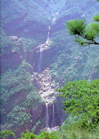 三叠泉瀑布汇集五老峰、大月山诸水,循着天工琢成的三级“冰阶”断崖折叠而下,故名,亦名三级泉、水帘泉。飞瀑流经的峭壁有三级,溪水分三叠泉飞泻而下,落差共155米,极为壮观,撼人魂魄。三叠泉每叠各具特色。一叠直垂,水从20多米的巅萁背上一倾而下;二叠弯曲,直入潭中。古人赞其“上级如飘云拖练,中级如碎石摧冰,下级如玉龙走潭,散珠喷雪,真天下绝景。”站在第三叠抬头仰望,三叠泉抛珠溅玉,宛如白鹭千片,上下争飞;又如百副冰绡,抖腾长空,万斛明珠,九天飞洒。如果是暮春初夏多雨季节,飞瀑如发怒的玉龙,冲破青天,凌空飞下,雷声轰鸣,令人叹为观止。