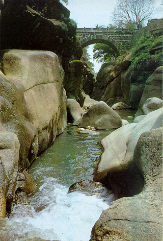 观音桥,座落于庐山东南麓的星子县境内,由白鹿洞循九星公路南行,经五里公社再折向西北行数公里,即可见一座石桥横跨高崖,这就是著名的千年古桥——观音桥。