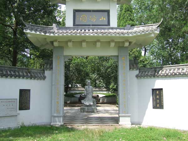 黄庭坚墓坐落在双井村西南,墓茔坐北朝南.黄庭坚(1045—1105),北宋治平四年(1067)进士,崇宁四年(1105) 9月客死在宜州(今广西宜山县)贬所,其墓是大观三年(1109)苏仙固、蒋纬护柩归葬双井祖茔之西,其墓宋代以来多次维修,1959年被列为江西省文物保护单位。1982年江西省人民政府拨款予以全面维修.修复后陵高1.93米,直径2076米.在召开黄庭坚960周年研讨会前,县政府又拨款对陵园进行了重修。陵园南面对着开阔的田野和远处的修河,南面大门楼上方有我国书法协会沈鹏同志的“山谷园”亲笔题词,左右两边题有“杭山拥翠碧水扬波此处诗魂称鼻祖,左史垂名右军揽胜先生笔法耀千秋”长联。四周是水泥围墙,墙外是一圈挺拔的白杨。据传说五六十年代墓地全是合抱的松、柏,可惜“大跃进”与“文革”时都被砍光……迎面是一尊黄庭坚的石雕,石雕四周用南京的雨花石铺地。然而据传说原来迎面是一堵类似照壁的短墙,中间镶刻着诗人的碑刻小像。像右上方镌刻着诗人自撰翁方纲书的偈语:似僧有发,似俗无尘。作梦中梦,见身外身。两侧为“看黄庭有味,笑白发无颜”的对联.碑像后是半球形的墓冢,墓前四柱三碑,两边的石碑上刻有诗人的生平,中碑则书刻“宋谥黄文节公之墓”,此碑为民国六年(1917年)修水知事所立,“文革”中散失,80 年代修墓时找回,陵园墓道回环,置有石椅,植有花木。墓地左边有一块田沟,菜园,到处盛开着一簇簇、一片片美丽的小花,它叫药菊,另一片是绿油油的茶园。