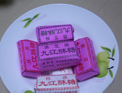 桂花酥糖”是九江副食的传统名产。它选用富强粉,白麻仁,白砂糖,饴糖及糖桂花为原料,精制而成。其色乳白,质地细嫩,具有骨脆、麻香、油润、甜爽、香醇等特点;并且有润肺、健胃、止咳的功效。是一种深受游客,尤其为妇孺老幼所喜欢的风味食品。