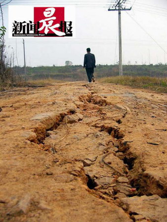 距离长江大堤九江段仅数十步之遥的地面裂缝