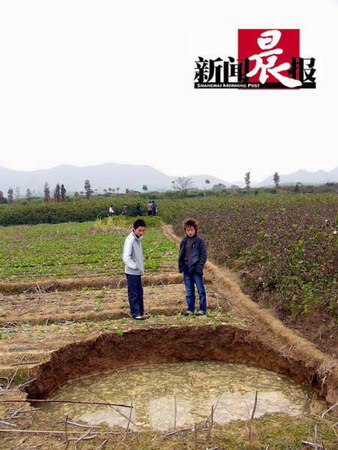 这个一人多深的水坑是长江支流长河防洪堤附近几处塌陷中口径最小的一个