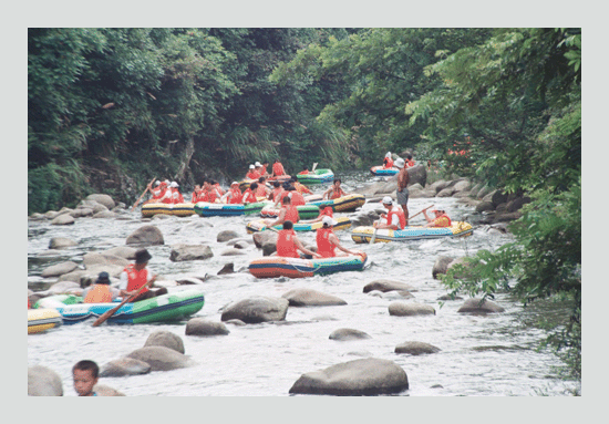 桃花溪漂流-----景区位于风景秀美、千岛落珠的柘林湖畔、海拔1100米的桃花尖山峰峡谷间。溪水常年不断地从桃花洞蜿蜒而下,时而在密林中通过,时而在巨石中穿行,千姿百态,落英缤纷。传说桃花仙子骑石龟顺溪而下,因而得名桃花溪。