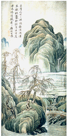 唐寅的这幅《庐山图》描绘的是庐山南麓三峡桥(即观音桥)一带的景色。三峡桥在庐山汉阳峰与五老峰夹峙的三峡涧上。涧外诸峰峥嵘兀立,涧中流水奔腾咆哮,涧边古树荫蔽数里,涧上石桥雄伟壮观。此间景色为山南一绝。