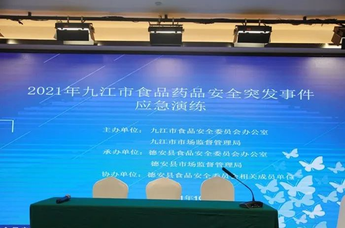 近日,2021年九江市食品药品安全突发事件应急演练在德安县举行。九江市食安办主任、市市场监管局党组书记、局长郑伟,德安县委副书记、县长艾菲出席演练活动。九江市食安办副主任、市市场监管局党组成员刘小毛作点评,德安县政府副县长金鹏致词。