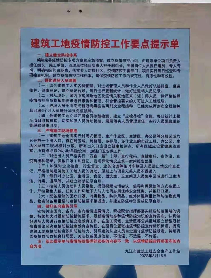 四是要做好正向宣传引导。要密切关注国内、省内、市内疫情进展情况,积极配合指挥部落实相应防控策略的调整,持续加大对最新防控措施要求、最新疫情动态和疫情防控知识的宣传发布。督促各建筑工地认真做好进场人员进行疫情防控交底教育工作,引导建筑从业人员自觉遵守疫情防控规定,提高建筑工地疫情防控意识和防控能力,持续巩固九江市建筑工地疫情群防群控良好局面。