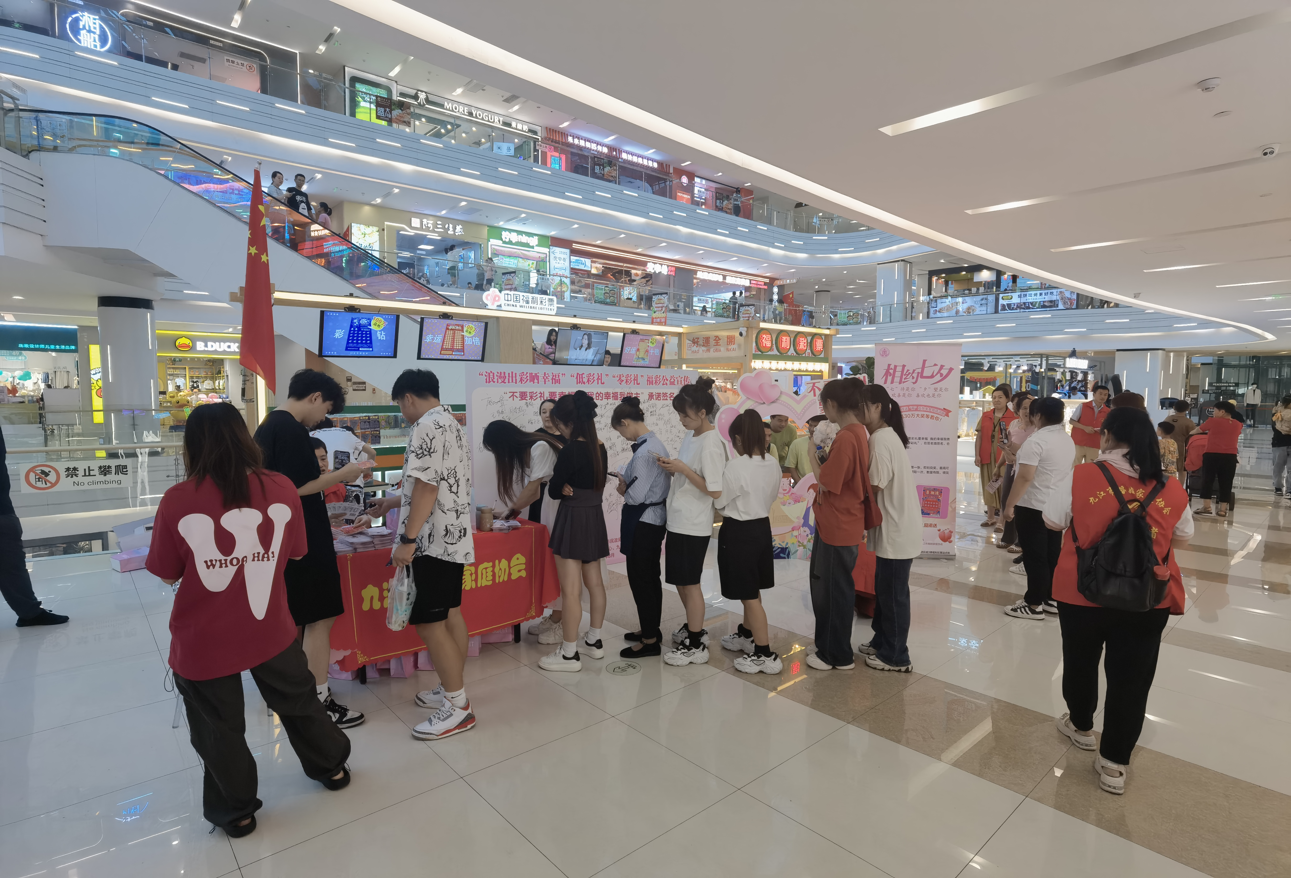 为持续弘扬社会主义核心价值观,倡导婚事新办、简办,抵制高价彩礼,8月22日,九江市民政局联合九江市福利彩票发行中心、九江市婚姻家庭协会在九江联盛快乐城3楼福利彩票站点,开展“浪漫出彩晒幸福”“低彩礼”“零彩礼”福彩公益宣传活动。