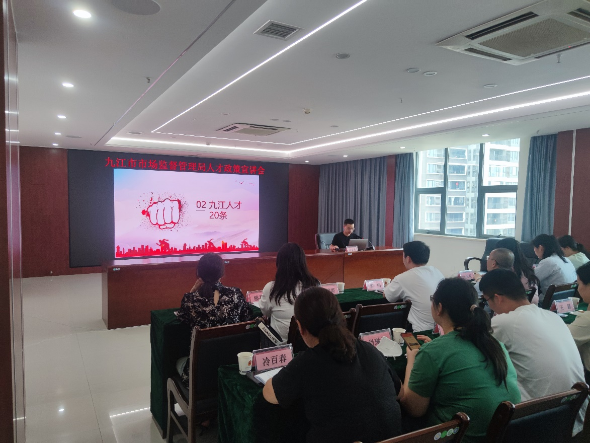 为进一步加大人才政策推介力度,提高省级重点人才政策和九江市《关于打造长江经济带重要人才集聚高地的若干举措》(简称“九江人才20条”)的知晓度,6月12日,市市场监管局组织召开了人才政策宣讲会,市局机关各科室、各直属单位人才宣传员30余人参加会议。