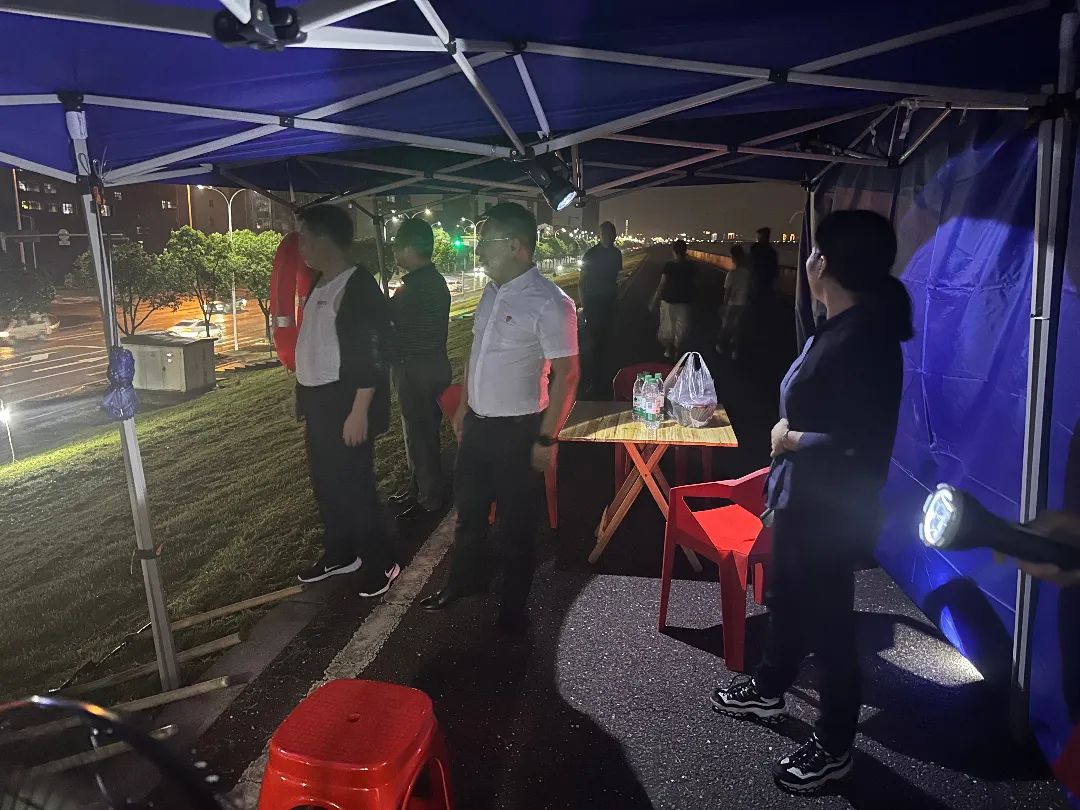 一名党员就是一面旗帜,一名干部就是一个标杆。市医保局 “党员突击队”,按照责任片区,在赛城湖东堤开展全面巡查。傍晚时分,局党组书记、局长唐建宇到值班点查看防汛值班情况,慰问值班同志。