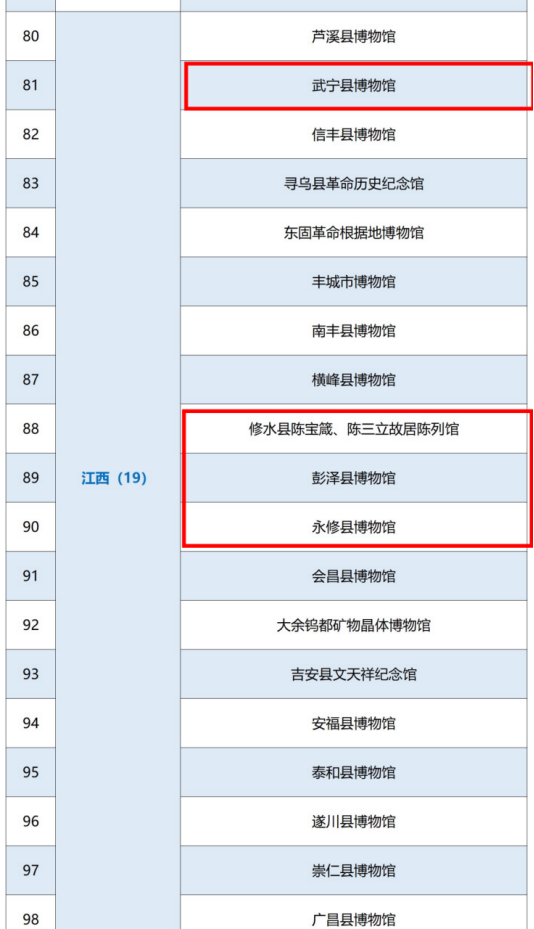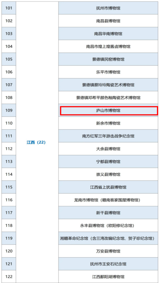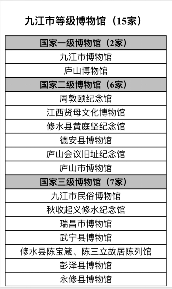 此次公布的第五批国家二、三级博物馆名单中,九江上榜国家二级博物馆1家、国家三级博物馆4家,共5家。其中,庐山市博物馆晋级为国家二级博物馆;武宁县博物馆、修水县陈宝箴陈三立故居陈列馆、彭泽县博物馆、永修县博物馆4家博物馆晋级为国家三级博物馆。