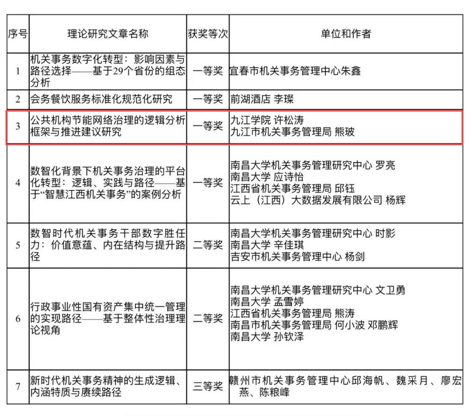 近日,全国机关事务管理研究会印发2024年研究成果鉴定结果通报,经中国行政管理学会、北京大学、中央财经大学专家组成的评审组鉴定,共评选出特别奖9篇,一等奖18篇,二等奖33篇,三等奖42篇,优秀奖64篇,优秀组织奖10个。其中,九江市管局报送的理论研究文章《公共机构节能网络治理的逻辑分析框架与推进建议研究》荣获一等奖。