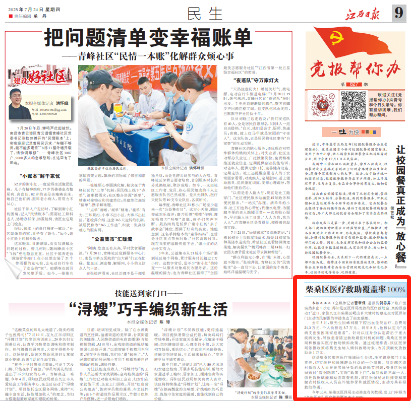 今年以来,柴桑区医保局主动筛查有关数据,变上门申报为“免申即享”,医疗救助覆盖率达100%。