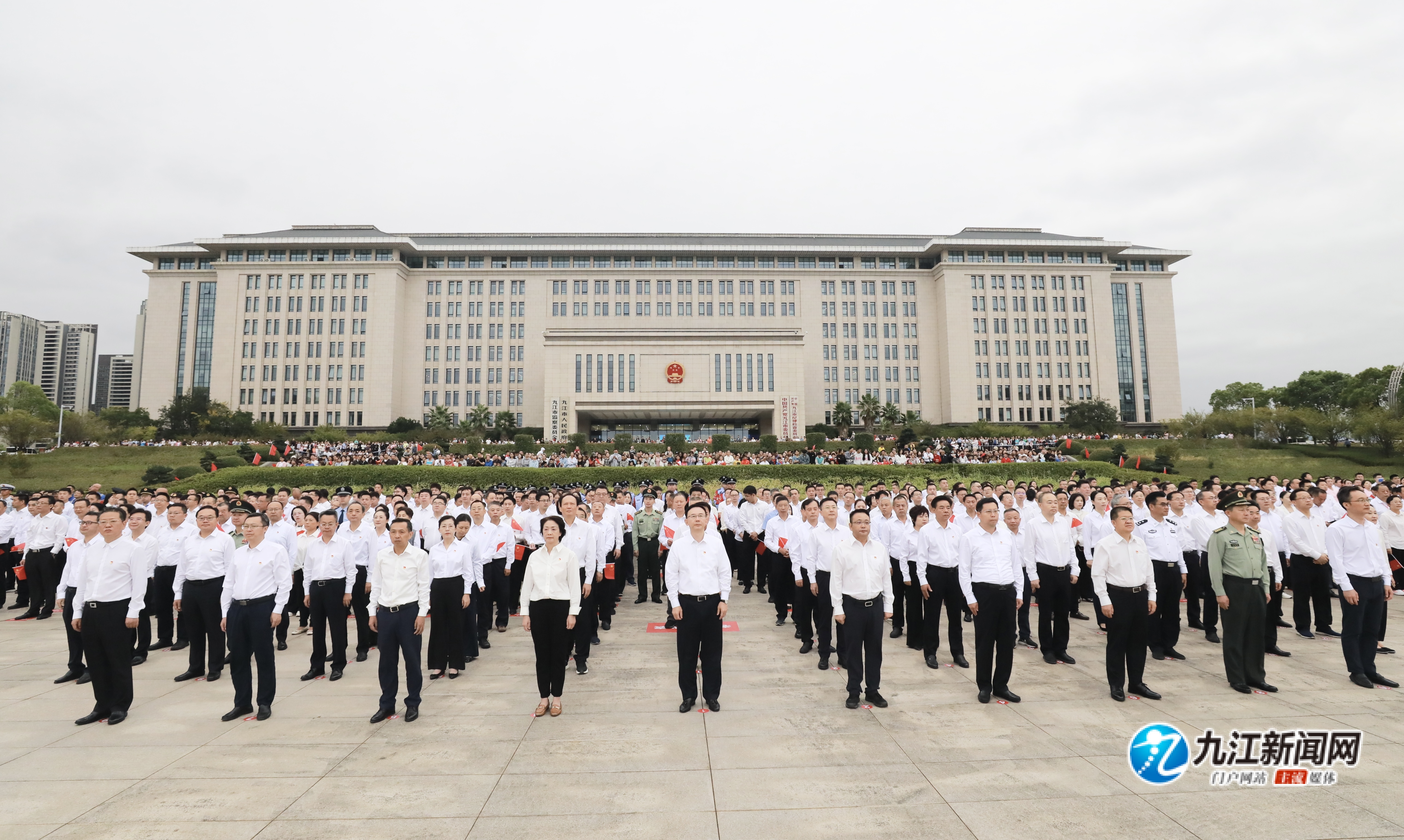 鲜亮中国红,激扬爱国情。一拨拨市民早早来到九江市民广场,共同等候那庄严神圣时刻的到来。舞蹈《请党放心 强国有我》开启仪式暖场环节,随后全场齐唱《我和我的祖国》《团结就是力量》,用激昂的歌声抒发对党和国家的无限深情和真挚赞美。