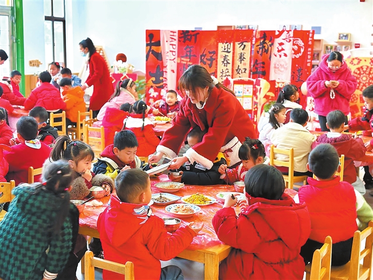 2025年12月29日,九江经开区永安中心幼儿园举办“庆元旦 吃年席”活动。孩子们身穿喜庆红衣,相互送上真诚的新年祝福。大家围坐共享美味年席,现场欢声笑语不断,共同迎接新年的到来。(魏梦婕 九江日报记者 张驰 摄)