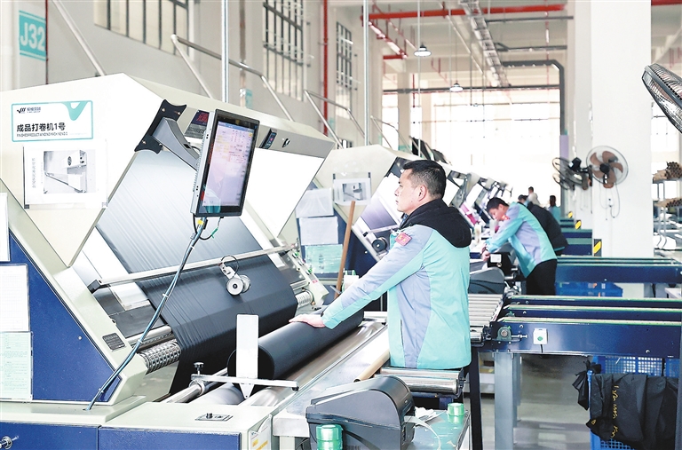日前,位于德安县的江西毅维纺织集团有限公司生产车间内,工人们正在加紧作业。该公司是一家以纺织为主、多元拓展的大型企业,主要集再生纱、织造、印染、涂层、印花、后整理于一体,构建纺织全产业链。目前企业订单不断,发展势头良好。(九江日报记者 张驰 摄)