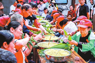 5月29日,庐山市南康镇西宁街,游客和居民们一起参加包粽子比赛。西宁街是江西省历史文化街区,当地文旅部门在对老街进行改造的同时积极引导开展群众性传统文化活动,让老街焕发新生成为文化旅游新亮点。(九江日报 特约记者 韩俊烜 摄)