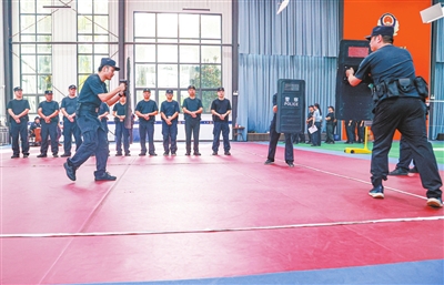 “格挡!下压!别肘!”近日,共青城市公安局训练场上热浪翻滚,数十名公安民警正在教官的指导下开展夏季警务技能考核。为了积极响应“夏季行动”工作部署,切实提升公安民警、辅警警务技能水平与应急处突能力,共青城市公安局于8月初开始,分批次对全局民警、辅警徒手控制、警械使用等警务技能进行培训、考核,确保全局实战单位民警、辅警的自身素质、应急处突能力、团队协作默契度都得到提高。图为民警正在进行夏季警务技能和警械使用考核。(九江日报 刘志坚 摄)