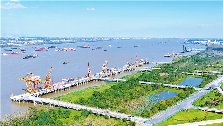 10月22日,九江港瑞昌港区公用码头装卸作业繁忙。瑞昌港区公用码头不断提升装卸效率,在保障安全前提下全力生产,确保辖区企业原材料供应充足、产品运输畅通。(魏东升 九江日报记者 张驰 摄)