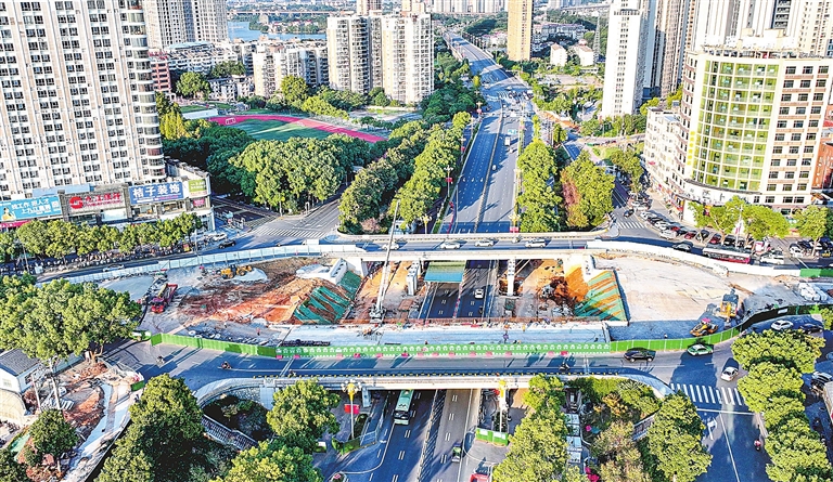 10月22日,长虹立交桥拓宽改造项目工地一片繁忙。目前,长虹立交桥预制箱梁的架设施工一侧已经架设完成,南侧箱梁正在架设施工中,主体工程已经完成75%。两侧箱梁架设完工后,将开展水稳施工、道路沥青铺设。(九江日报记者 欧阳海员 摄)