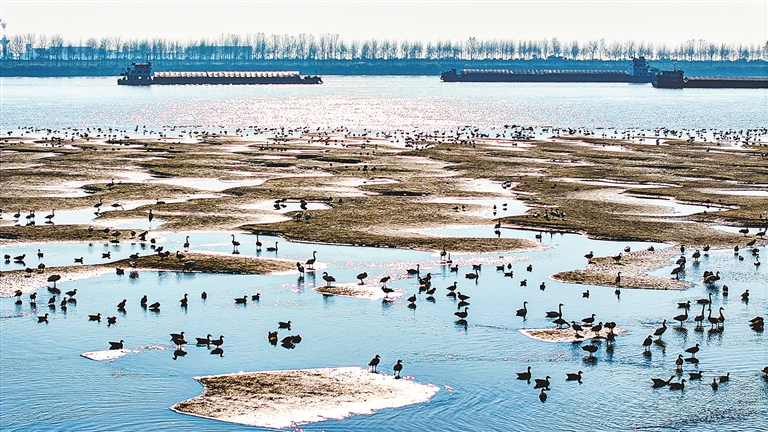 十一月二十一日,长江九江段永安大堤附近的滩涂之上,成群越冬候鸟在此停歇、嬉戏。时值长江低水位期,裸露的滩涂成了越冬候鸟的栖息乐园。(九江日报记者 李涛渊 摄)