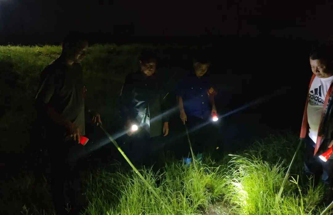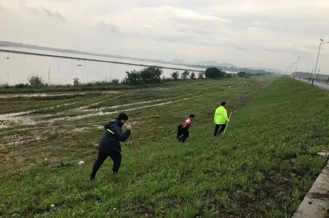 区城市管理局迅速抽调人员集结队伍,党员干部带队,党员干部挺在前,连夜赶往新洲垦殖场。到达新洲农垦场三分场后,立即领取15号哨所的防汛值守巡查任务。带队领导组织党员干部职工第一时间投入防汛险情排查,几人排成一排,一步一步,逐点排查堤坝背坡面,有无渗漏冒泡,一段一段排查堤下坡脚湿地和水沟,查看水流来源……不放过一处可疑的情形。