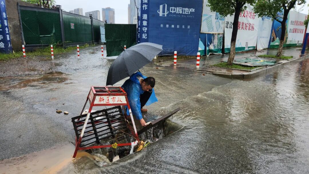 同时,因城区内涝,多路段进行了暂时管制,交管部门安排力量在各交通要道进行指挥疏导。新区市政部门在严重积水路段清理淤积物,疏通泄水口,对倒伏树木进行截、清、运紧急处置,解决道路积水和管网冒溢问题,优先保障交通顺畅和行人安全,护一方安澜。
