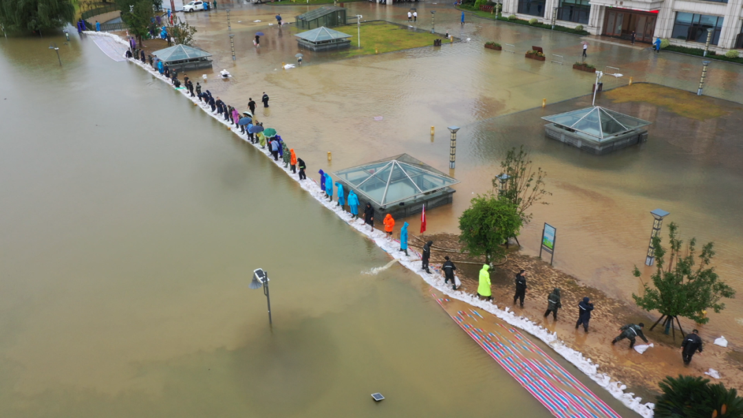 八里湖南岸由于滨水地势较低,汛期来临时极易积水。一大早大水已经漫过堤岸,在广场上形成一片“汪洋泽国”,党员干部冒着瓢泼大雨在湖边筑起一道白色的人工沙堤,阻挡洪水向市区蔓延。