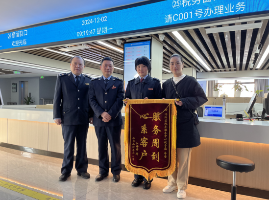 12月2日,九江市浔阳区政务服务大厅税务窗口出现了温馨的一幕,纳税人江女士为税务窗口工作人员廖蕾送来了一面写着“服务周到 心系客户”八个大字的锦旗,专程感谢廖蕾同志真诚细致的服务,小小的锦旗不仅是对税务工作者践行服务宗旨、真诚为民服务的生动体现,也是对浔阳区高质量政务服务工作的肯定。