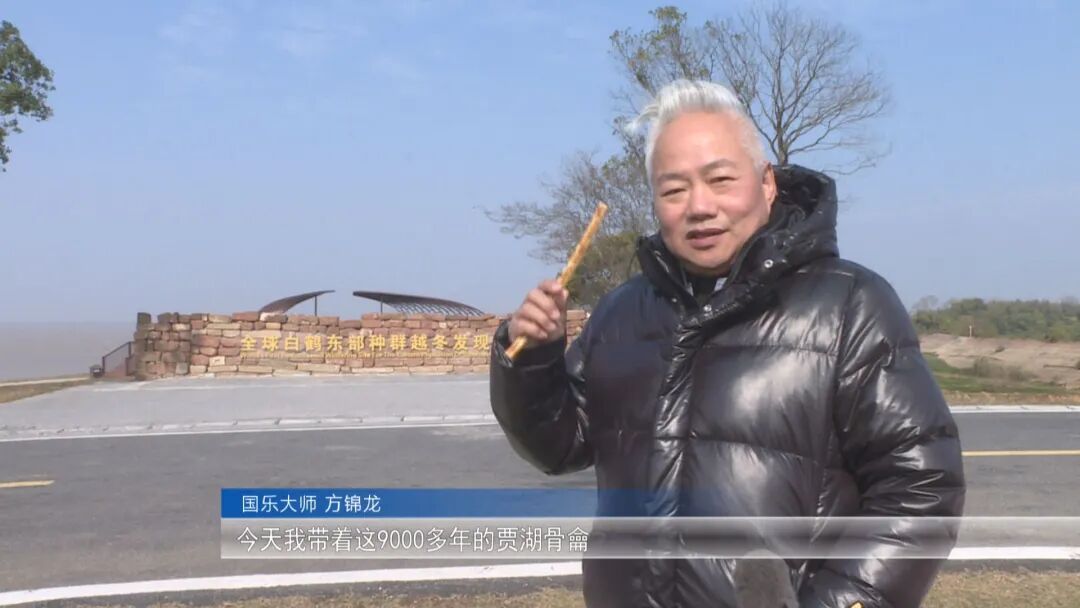 国乐大师方锦龙说:“今天,我带着这9000多年的贾湖骨笛,来到我们全球白鹤东部种群越冬发现地,非常有意义,大家看着前面,那些都是白鹤。”