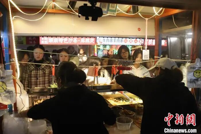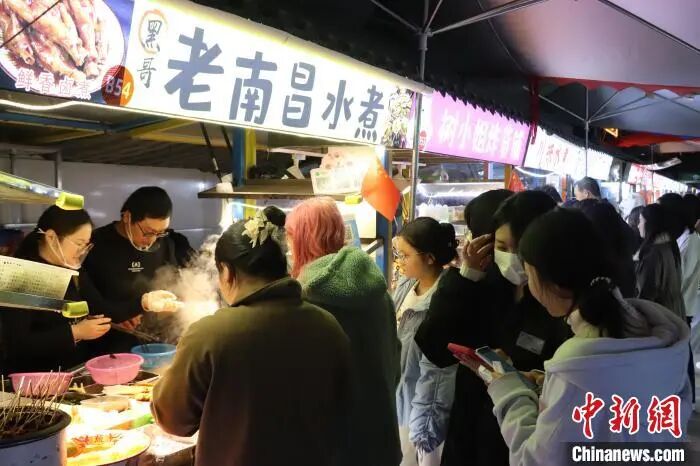 12月5日,江西省九江市八里湖新区九派青年夜市,不少民众晚上前来“打卡”消费。该夜市是八里湖新区引进产业园区运营公司投资打造的“网红”夜市,每到夜晚生意火热,是当地夜经济消费新地标。图为九派青年夜市,不少民众晚上前来“打卡”消费。中新社记者 熊锦阳 摄