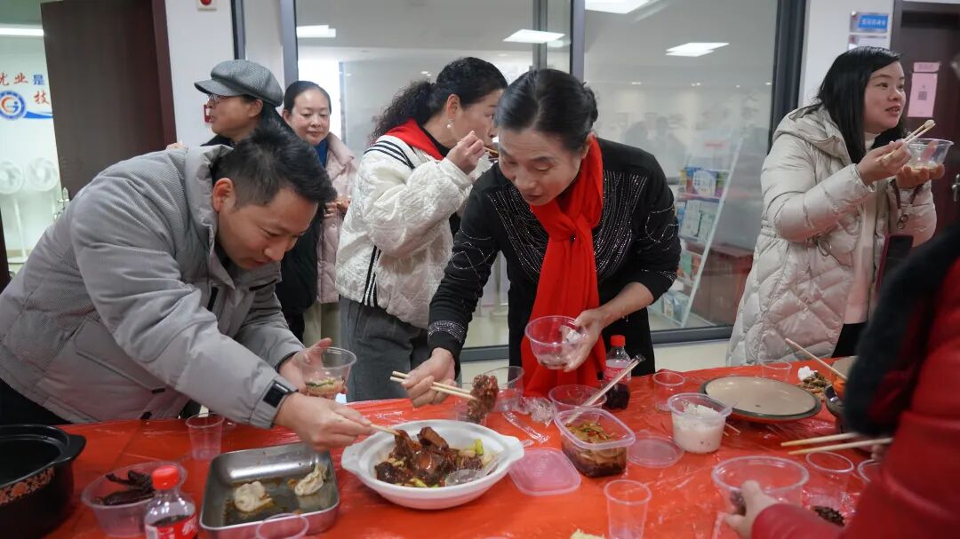 一大早,社区工作人员精心布置好了长桌,摆放上了喜庆的饮品和水果,居民正在家中准备各种美味佳肴,喜庆的音乐氛围营造着“拉满”了大家的期待。上午11点半,居民们陆续端来自己精心准备的拿手好菜,粉蒸肉、香菇炖鸡、红烧肉、油焖大虾、修水哨子、水饺、蛋糕等各式各样的点心、汤羹、零食摆满长桌,香气扑鼻,色泽诱人。居民们围坐在一起品尝美食、切磋厨艺,举杯庆祝、谈笑风生,脸上洋溢着幸福的笑容,大家在交流中更加深了邻里情谊。