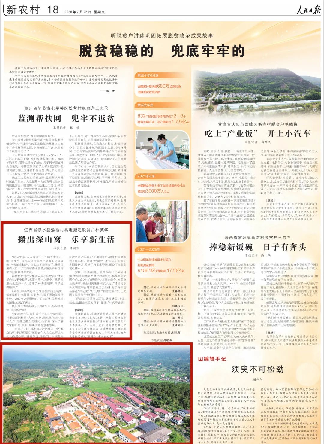 7月25日,《人民日报》18版整版专栏稿件《脱贫稳稳的 兜底牢牢的》,其中以《搬出深山窝 乐享新生活》为题,单条+图文报道了我县黄沙镇汤桥村易地搬迁脱贫户过上了安居乐业的幸福新生活。