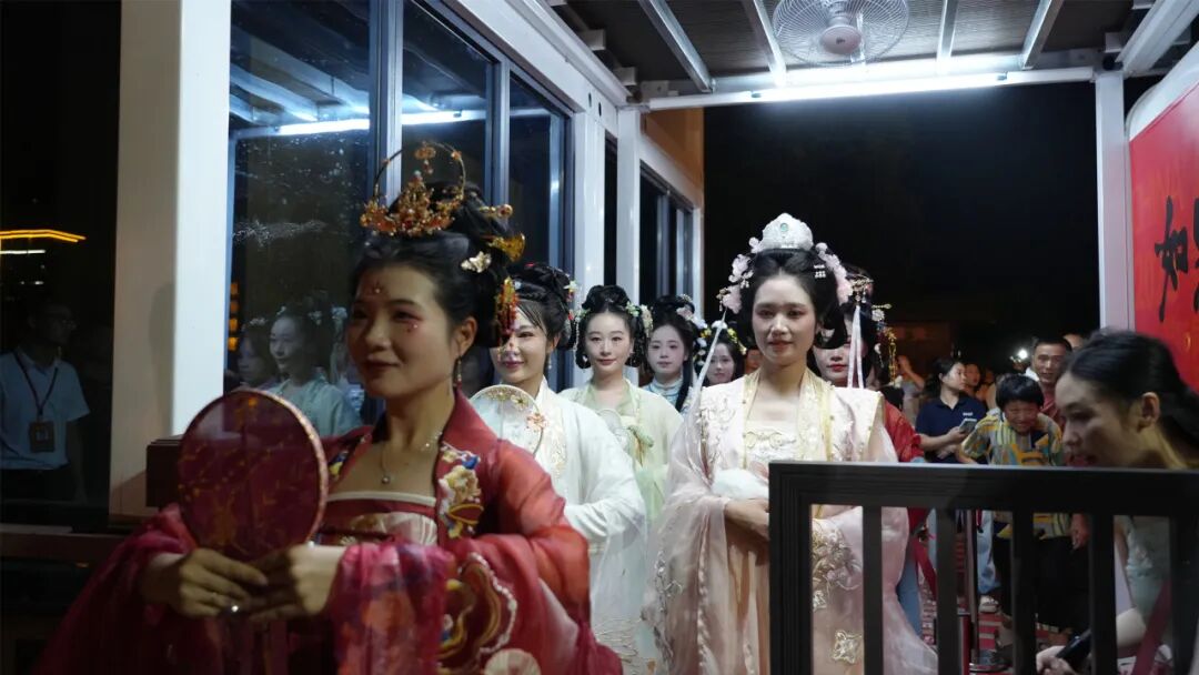 当晚,一场庄重的中秋拜月仪式在修江河畔举行。十余名身着汉服的女子依古礼祭拜月神,表达祈福丰收、团圆美满的美好愿望。据景区工作人员周清平介绍,拜月仪式寄托了人们对美好生活的向往与期盼。