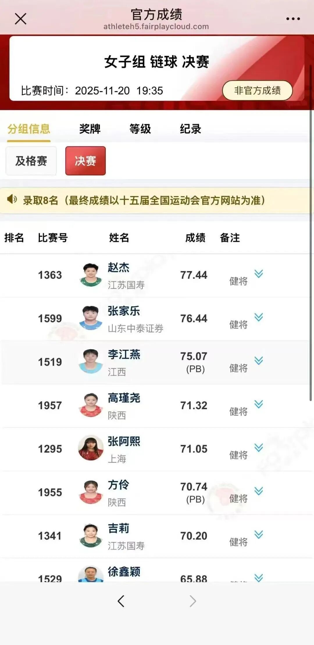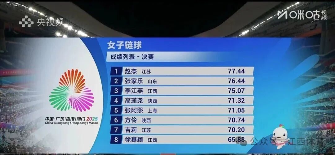 11月20日晚,在广东省奥体中心体育场举行的第十五届全国运动会女子链球决赛中,修水籍运动员李江燕奋勇拼搏,以75.07米的成绩获得该项目铜牌,刷新个人最好成绩,为本届全运会江西代表团再添一枚奖牌,为家乡修水争得了荣誉!