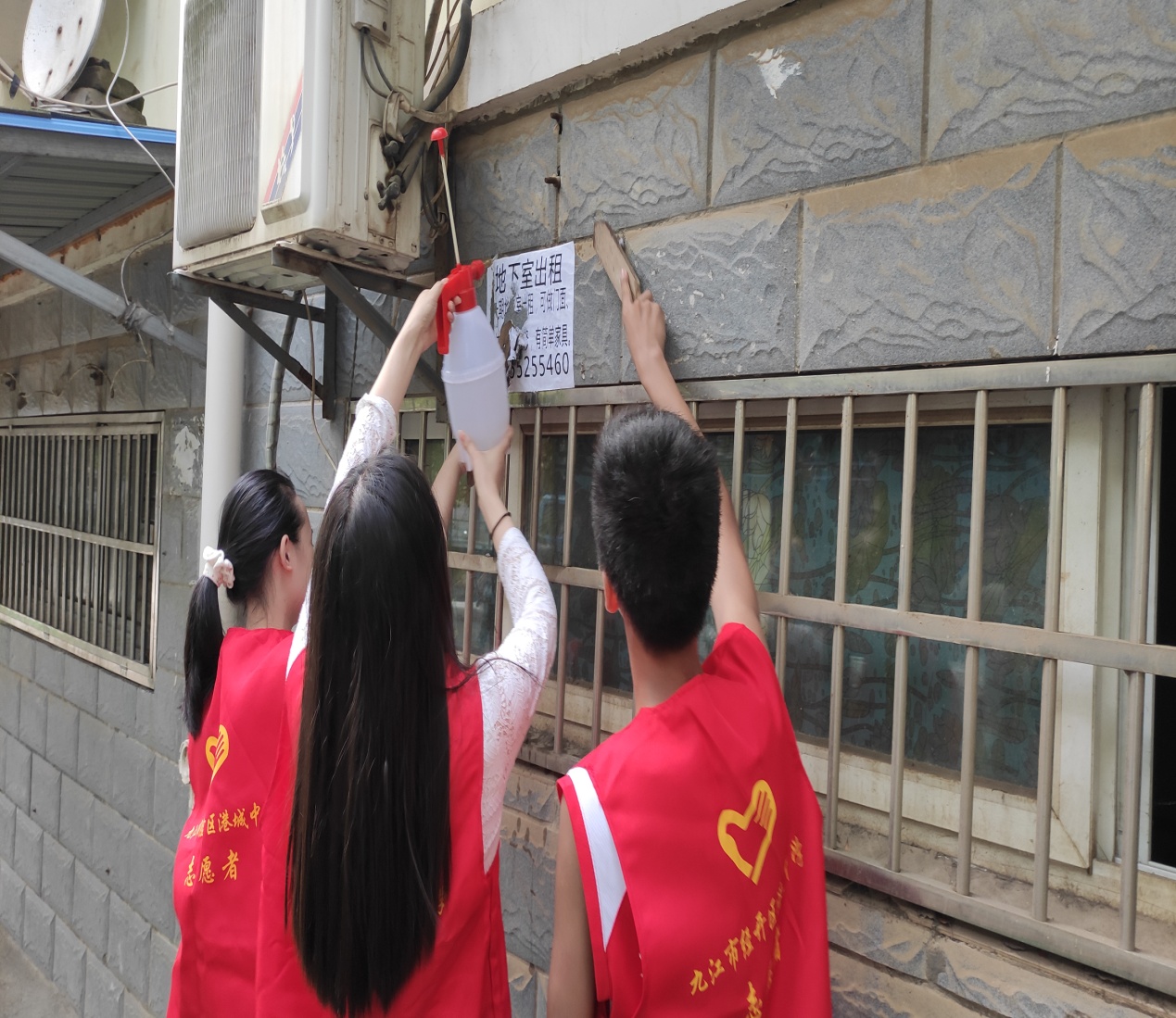 争做美化环境急先锋-志愿者们对辖区范围内开展拉网式牛皮癣清理,有的用小铲子铲,有的用喷壶往广告上浇水,还有的用小板刷子刷,个个以饱满的热情投身到活动中,虽然时处高温季节,大家身上衣服都被汗水湿透,但没有一个人叫。在志愿者的带动和影响下,不少社区居民也自发地参与到清理活动中,经过一下午的努力,小区内形形色色的大小广告,在大家的互相合作下,小区环境焕然一新。据统计:参加此次活动的志愿者50余人,共发放九江市创建文明城市倡议书500余份、清理牛皮廯80余处、交通劝导20余人。志愿者们饱满的参与热情,认真的工作态度赢得了社区居民的一致好评。(汤恒阳)