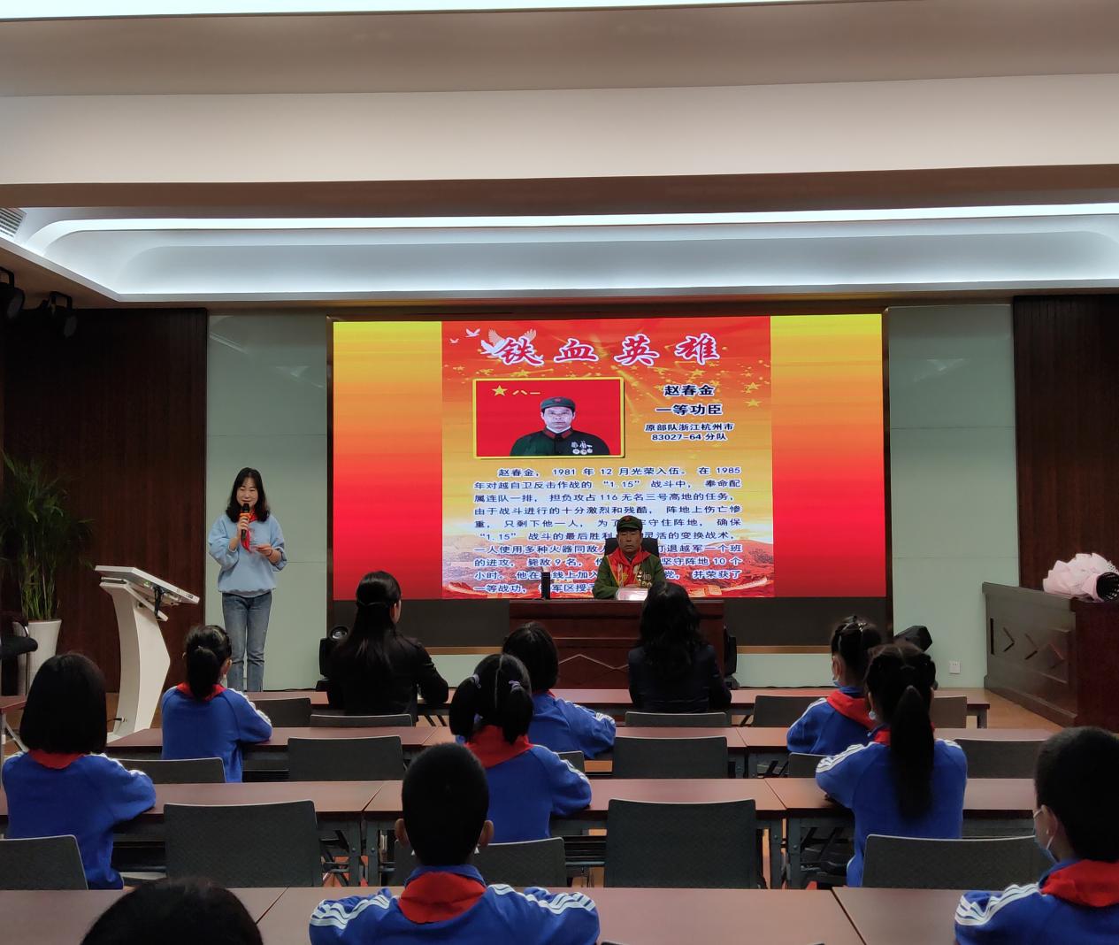 伊始,少先队员给赵春金爷爷献鲜花、系红领巾、敬少先队礼,一首诗歌朗诵《我的祖国》,以自己的方式热烈欢迎"最可爱的人”。随后,赵爷爷向同学们讲述了他在战争时期是如何与敌人斗智斗勇,夺取胜利的故事。随着赵爷爷的深情讲述,再次回到36年前那烽火硝烟的战场,同学们与赵爷爷一起重温那段刻骨铭心而波澜壮阔的岁月,去了解他的英勇事迹。这样一位纯粹、高尚的英雄,值得、也应该被尊敬!他的功劳也应该被铭记,被传颂!为表示对战斗英雄致以崇高的敬意,全体少先队员起立,向赵爷爷敬礼。在赵爷爷的引导下,相信同学们会更加认真学习党的历史,传承红色基因,时刻牢记党的重托,努力学习,不负使命,争做新时代好少年。活动的最后,少先队员代表上台带领同学们向党旗敬礼。