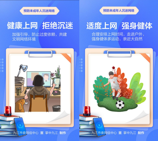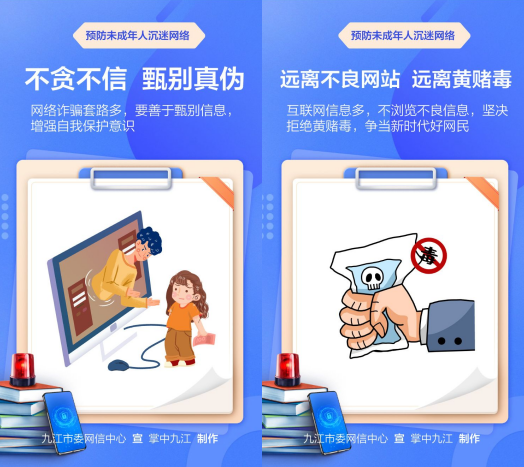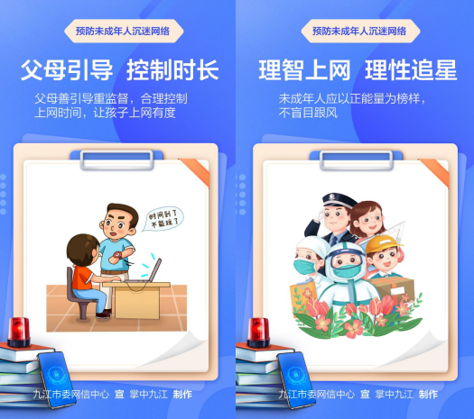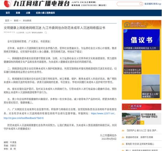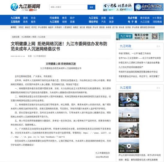 在全市各级网络媒体发布《文明健康上网 拒绝网络沉迷!九江市委网信办发布防范未成年人沉迷网络倡议书》,倡议社会各界共同努力防范未成年人沉迷网络,做预防未成年人网络沉迷的践行者和传播者。
