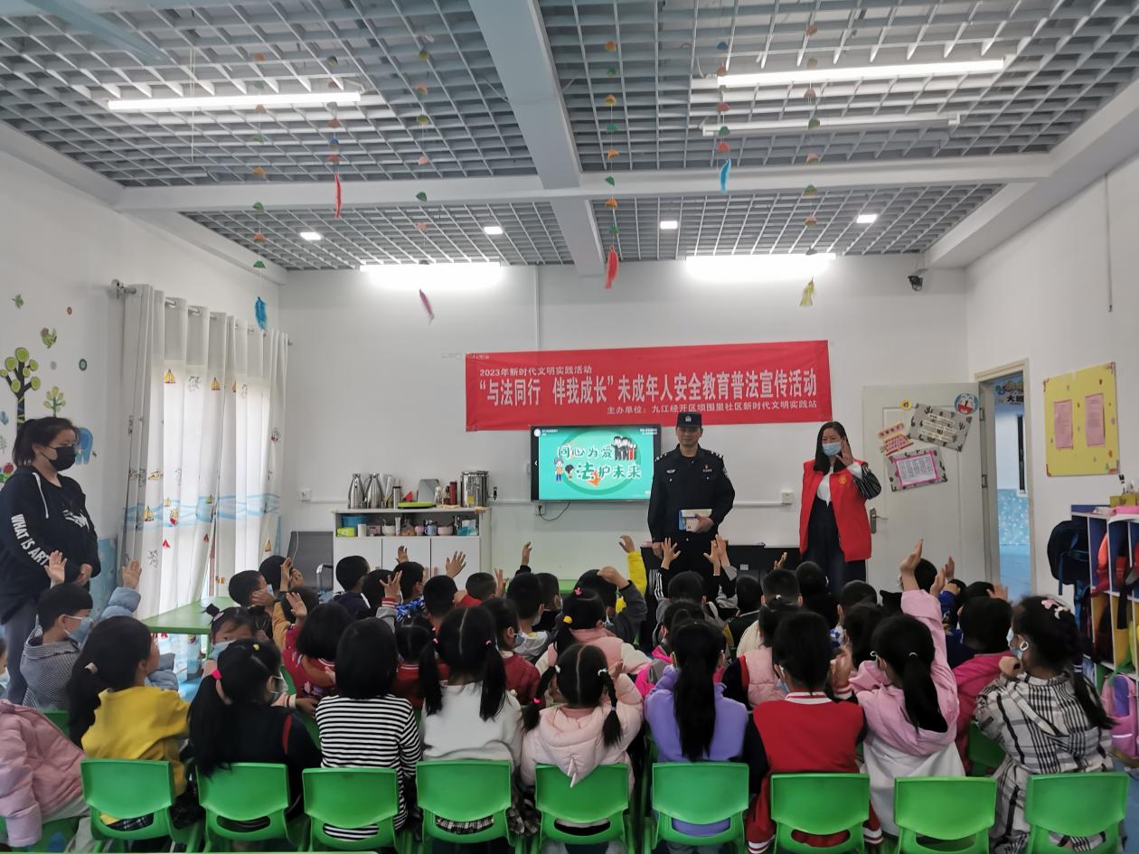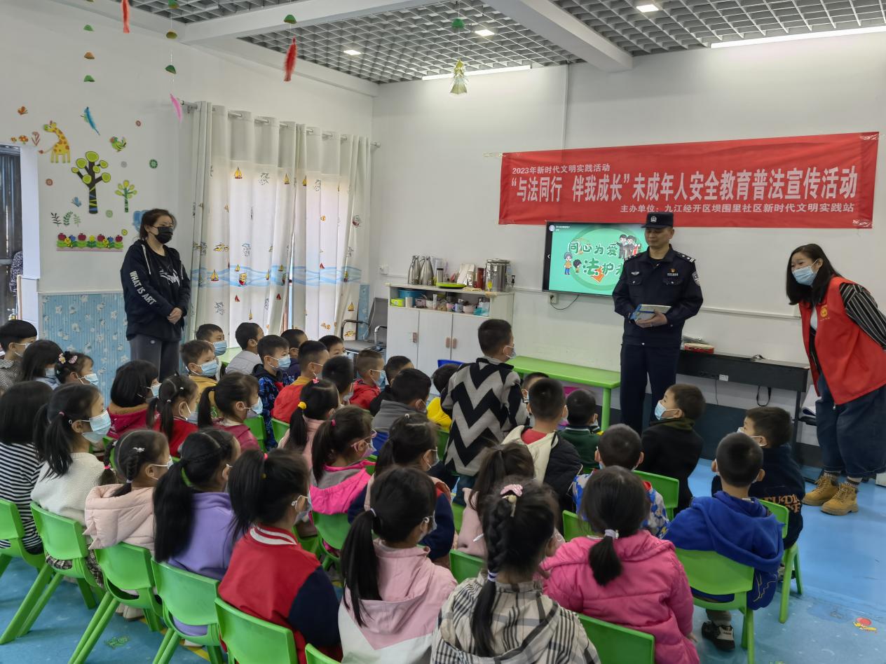 4月26日,九江经开区滨兴街道坝围里社区新时代文明实践站联合区帮扶单位经开区组织和人力资源部、滨兴派出所开展“与法同行 伴我成长”未成年人安全教育普法宣传活动。