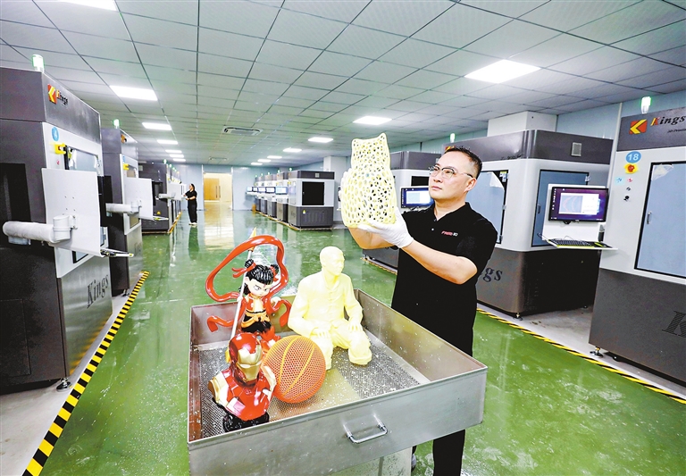 日前,落户九江经开区的江西金石增材制造有限公司、江西自由三维打印有限公司正式投入运营,运用3D打印技术生产的首批1000余平方米的大型文创产品订单顺利交付安徽客户,标志着区域增材制造产业发展迈入新阶段。项目依托高精度3D打印技术,生产轻量化结构件、定制化模具、功能测试件等精密部件和文创产品的定制化打造。未来金石三维九江项目将致力建成全国首个“3D打印+文创”产业示范基地、文创产品出口基地以及文创3D打印展示中心,为我市产业高质量发展注入新动能。图为企业生产车间。(九江日报特约记者 黄安 摄)