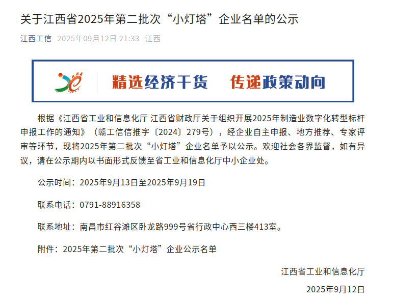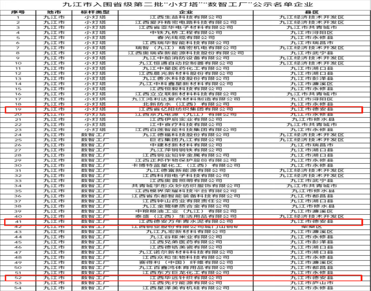 9月12日,江西省工业和信息化厅发布《关于江西省第二批“数字领航”和“数智工厂”名单的公示》和《关于江西省2025年第二批次“小灯塔”企业名单的公示》。我县入围第二批“数智工厂”和“小灯塔”企业3家。其中,江西华远针织有限公司和江西德安万年青水泥有限公司入围“数智工厂”,江西省亿阳纺织集团有限公司入围“小灯塔”企业。